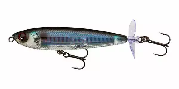 Wave Motion Technology and polycarbonate ultraviolet rear prop with counter cupped blades throws water in all directions. These features send out a constant splash and vibrations that mimic panicked baitfish. Fish it like a popper with a “Pop ’n Stop” action for explosive bites on the pause.